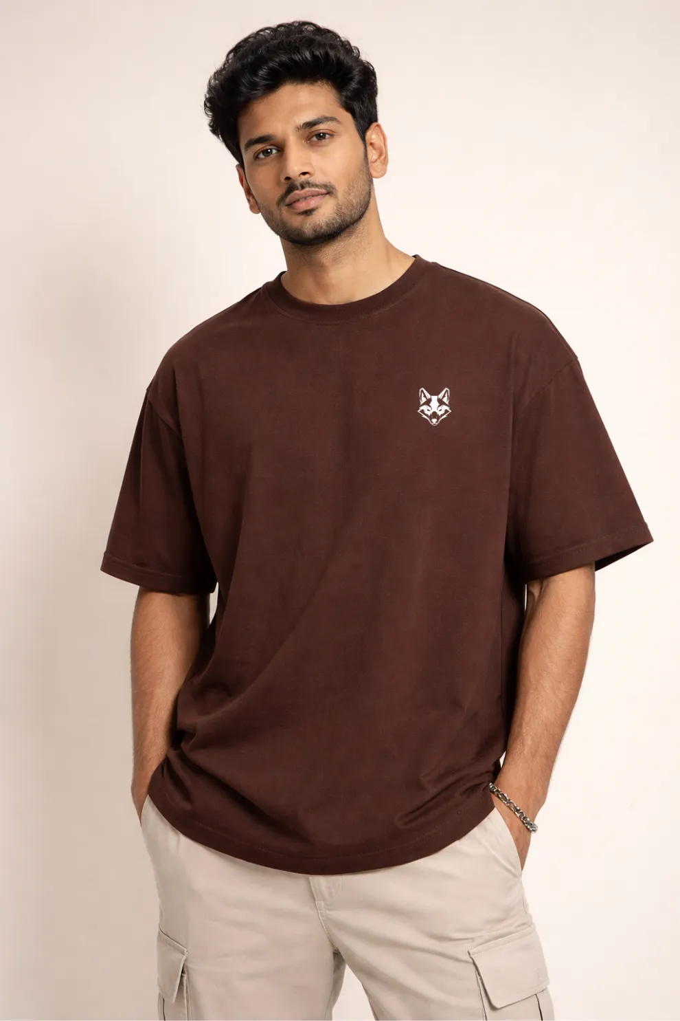 A brown Oversized drop-shoulder tee crafted from 240 GSM bio-washed loop-knit cotton, featuring a cinematic illustration inspired by survival, hope, and a broken world.